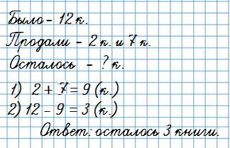 2. У продавца было 12 книг. Утром он продал 2 книги, а днём ещё 7 книг. Сколько книг осталось у продавца?