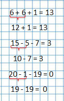 | 8 + 8 - 16 = 0 | 6 + 5 - 10 = 1 | 20 - 1 - 19 = 0 |