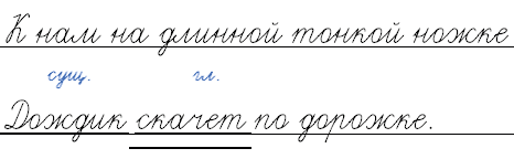 Дождик (им. сущ.) скачет (глагол) по дорожке.