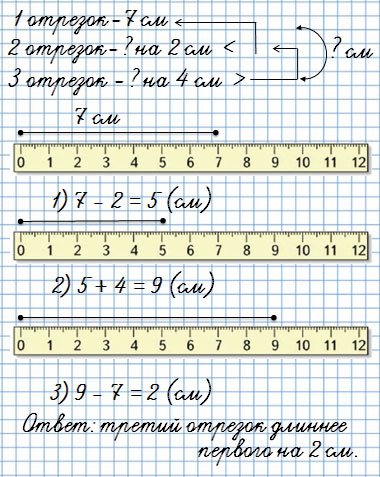 Ваня начертил три отрезка. Первый длиной 7 см, второй на 2 см короче первого, а третий на 4 см длиннее второго. На сколько сантиметров третий отрезок длиннее первого?
