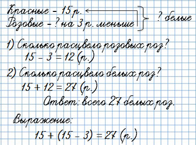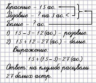 7. На клумбе расцвели 15 красных астр, розовых на 3 меньше, а белых астр столько, сколько красных и розовых вместе. Сколько белых астр?