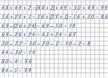 | 48 + 49 + 2 = (48 + 2) + 49 = 50 + 49 = 99 | 30 - 22 = 30 - (20 + 2) = (30 - 20) - 2 = 10 - 2 = 8 |