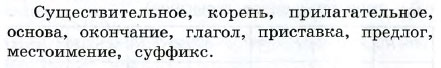 В одну группу выпиши части речи, а в другую группу - части слова.