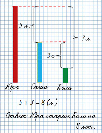Саша старше Коли на 3 года, но младше Юры на 5 лет. На сколько лет Юра старше Коли?