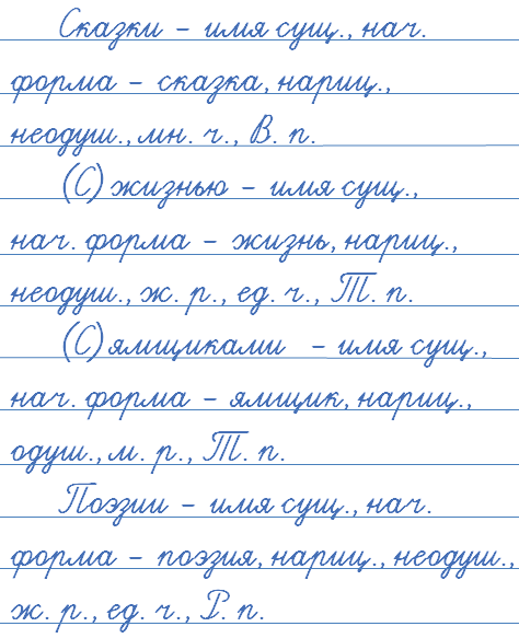 Выберите из выделенных в тексте существительных любые четыре слова. Выпишите их. Сделайте полный анализ выписанных имён существительных по образцу.