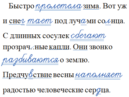 Быстро _______ зима. Вот уж и сне.. _______ под луч..ми со..нца. С длинных сосулек _______ прозрач..ные капли. Они звонко _______ о землю. Предчувствие весны _______ радостью человеческие сер..ца.