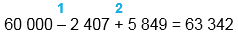 | 60 000 - 2 407 + 5 849 = 63 342 | |