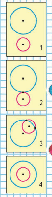 На обоих рисунках две окружности: большая голубая и маленькая розовая. На обоих рисунках у окружностей нет общих точек, но на первом рисунке окружности находятся рядом друг с другом, а на четвёртом одна окружность внутри другой.