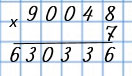 Умножаю единицы: 9 • 7 = 63. 63 ед. - это 6 дес. и 3 ед., 3 ед. пишу под единицами, а 6 дес. запомню и прибавлю к десяткам после умножения десятков.