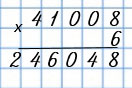 Умножаю сотни: 6 • 7 = 42. 42 сот. - это 4 ед. тыс. и 2 сот.; 2 сот. пишу под сотнями, а 4 ед. тыс. пишу под единицами тысяч, так как других единиц тысяч для умножения нет.