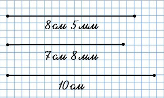 342. Начерти три отрезка. Длина первого 8 см 5 мм, что на 7 мм больше длины второго и на 1 см 5 мм меньше длины третьего отрезка.