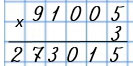 Пишу (единицы под единицами, десятки под десятками, сотни под сотнями, единицы тысяч под единицами тысяч, десятки тысяч под десятками тысяч): 91 005 • 3.
