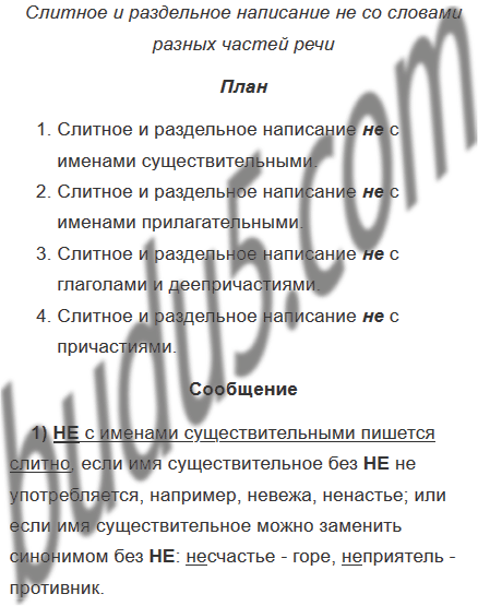 Используя материалы упр. 136—144, составьте план выступления «Слитное и раздельное написание не со словами разных частей речи». Опираясь на этот план, подготовьте сообщение.