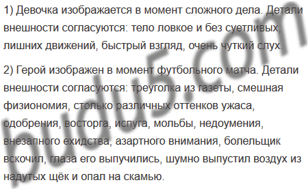 С первых же минут внимание Коли отвлёк от того, что делалось на поле, сидевший неподалёку маленький пожилой болельщик. На голове у него была треуголка из газеты. Так выразительна была эта смешная физиономия под бумажным колпаком, столько различных оттенков ужаса, одобрения, восторга, испуга, мольбы, недоумения, внезапного ехидства, азартного внимания сменяли на ней друг друга, что Коля не мог глаз отвести. Вот болельщик вскочил, глаза его выпучились, застыли и вдруг смежились удовлетворённо. Он шумно выпустил воздух из надутых щёк и опал на скамью. (По Л. Кассилю)