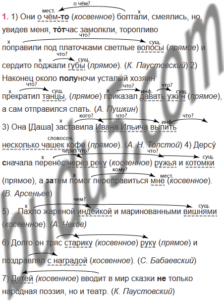 1. Прочитайте. Спишите, расставляя недостающие знаки препинания и раскрывая скобки. Найдите дополнения и определите, чем они выражены. В скобках укажите, прямое это дополнение или косвенное.