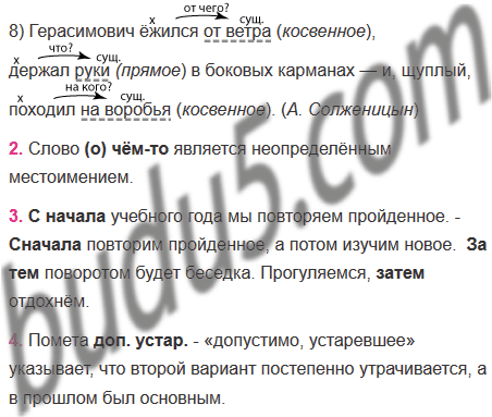 1)Они о чём(то) болтали смеялись, но, увидев меня, (то́т)час замолкли торопливо поправили под платочками светлые волосы и сердито поджали губы. (К. Паустовский) 2) Наконец около (полу)ночи усталый хозяин прекратил танцы приказал давать ужин а сам отправился спать. (А. Пушкин) 3) Она [Даша] заставила Ивана Ильича выпить несколько чашек кофе. (А. Н. Толстой) 4) Дерсу́ (с)начала перенёс через реку ружья и котомки а (за)тем помог переправиться мне. (В. Арсеньев) 5) ...Пахло жареной индейкой и маринованными вишнями. (А. Чехов) 6) Долго он тряс старику руку и поздравлял с наградой. (С. Бабаевский) 7) Детей вводит в мир сказки (не)только народная поэзия но и театр. (К. Паустовский) 8) Герасимович ёжился от ветра держал руки в боковых карманах — и, щуплый, походил на воробья. (А. Солженицын)