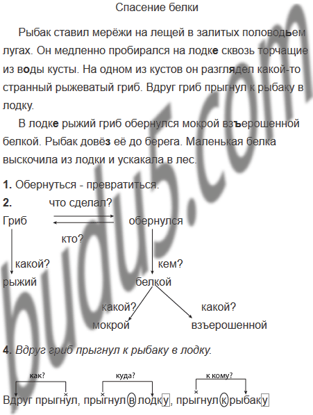 В лодк.. рыжий гриб обернулся мокрой вз(?)ерошенной белкой. Рыбак довё.. её до берега. Маленькая белка выскочила из лодки и ускакала в лес.