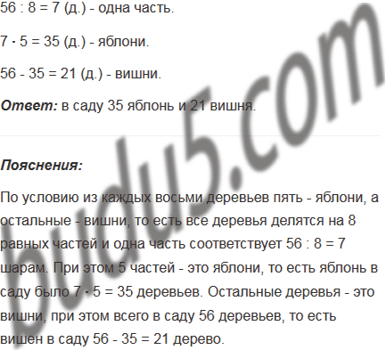 В саду растёт 56 деревьев. Из каждых восьми деревьев пять - яблони, а остальные - вишни. Сколько яблонь и сколько вишен растёт в саду?