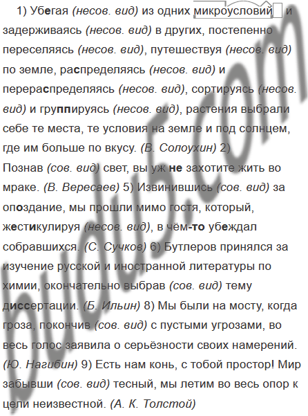 1) Уб..гая из одних микроусловий2 и задерживаясь в других постепенно переселяясь путешествуя по земле ра(з, с)пределяясь и перера(з, с)пределяясь сортируясь и гру(п, пп)ируясь растения выбрали себе те места, те условия на земле и под солнцем, где им больше по вкусу. (В. Солоухин) 2) Познав свет вы уж (не)захотите жить во мраке. (В. Вересаев) 3) Внук чу(?)ствуя свою вину на ц..почках крутился возле бабушки, заискивающе заглядывал ей в глаза, но бабушка еле ..держивая улыбку, старалась быть строгой и непр..кло(н, нн)ой. (И. Смирнов) 4) Спотыкаясь на ступенях (не)освещё(н, нн)ой лестницы ребята спускались всё ниже и ниже. (Г. Пронин) 5) Извинившись за оп..здание мы прошли мимо гостя, который ж..ст..кулируя в чём(то) уб..ждал собравшихся. (С. Сучков) 6) Бутлеров принялся за изучение русской и иностранной литературы по химии окончательно выбрав тему д..(с, сс)ертации. (Б. Ильин) 7) Внизу делает круг обходя разруше(н, нн)ую мельницу река. (Л. Зуров) 8) Мы были на мосту, когда гроза покончив с пустыми угрозами во весь голос заявила о серьёзности своих намерений. (Ю. Нагибин) 9) Есть нам конь, с тобой простор! Мир забывши тесный мы летим во весь опор к цели неизвестной. (А. К. Толстой)