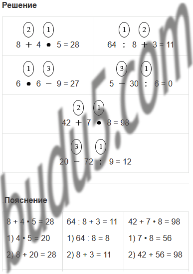 | 8 + 4 • 5 | 64 : 8 + 3 | 42 + 7 • 8 |