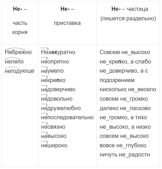 | Не- – часть корня | Не- – приставка | Не- – частица (пишется раздельно) |