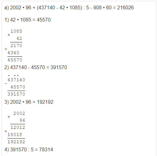 | а) 2002 • 96 + (437140 - 42 • 1085) : 5 - 908 • 60 |
