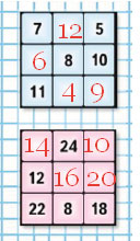 Сложи числа в каждом квадрате по строкам, по столбцам, из угла в угол. Если суммы равны, то такой квадрат называется магическим.