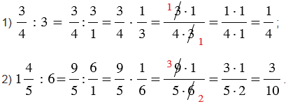 При делении дроби на натуральное число, учитываем то, что любое натуральное число можно представить в виде дроби со знаменателем 1, затем пользуемся правилом деления дробей.